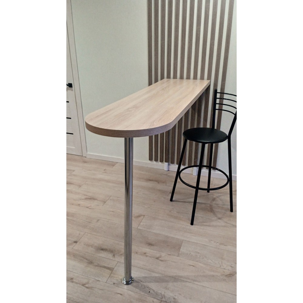 Барная столешница, толщиной 38 мм, опора труба хром, крепление трубы к столешнице, 2 уголка 120 мм. с пластиковой накладкой для крепления столешницы к стене, саморезы, инструкция по сборке.